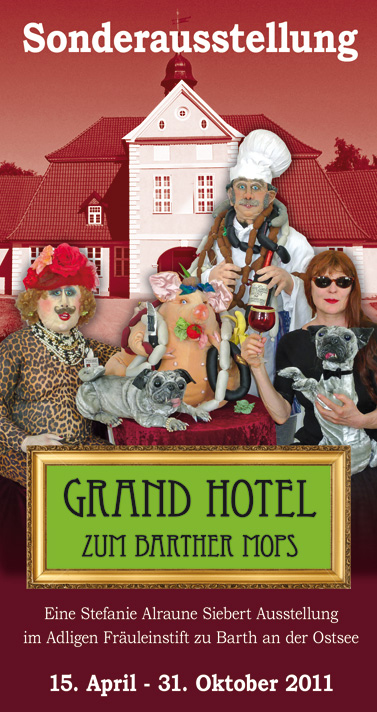 ZUM BARTHER MOPS 15. April - 09. November 2011 Adliges Fräuleinstift zu Barth an der Ostsee Weitere Informationen zur Ausstellung: www.vineta-museum.de Ausstellungsort: Adliges Fräuleinstift Hunnenstraße 2 18356 Barth Öffnungszeiten "Grand Hotel zum Barther Mops" 10:00 bis 18:00 ![]() HAUTE COUTURE Die Modenschau der feinen Küche 63 menschengroße Textilfiguren begleitet von 1001 Objekten auf dem Laufsteg. Die Models werden keine g e w ö h n l i c h e Kleidung tragen! Die Köstume bestehen aus genähten Delikatessen. Auf der Bühne stehen Vorspeise, Fischgang, Hauptspeise und Nachtisch, getragen von Alraune-Figuren, beklatscht von einem schrägen Publikum inmitten eines Blitzgewitters genähter Fotografen.