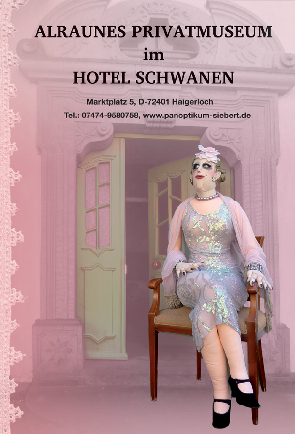 Über Herbst/Winter 2013/14 verwandelt sich der „Haigerlocher Schwanen“, bisher historischer Gasthof mit Hotel, in Alraunes Museum, prall gefüllt mit HOTELSZENERIEN Nach 6 Ausstellungsjahren in Barth (Ostsee) hat Alraune im Schwanen in Haigerloch (nahe der Burg Hohenzollern) eine neue Heimat gefunden. Erster Ausstellungstag ist der 20. April, Ostersonntag 2014 |