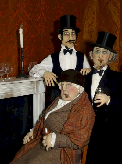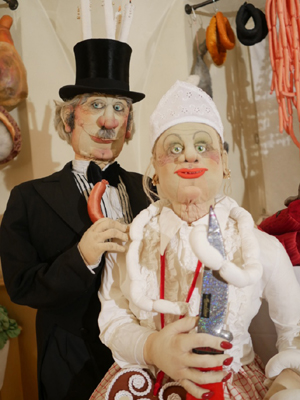 Der Fundus hat beachtliche Ausmaße und die Szenerien füllen das ehemalige Sterne-Restaurant mit Hotel, den „Schwanen“ am Marktplatz in Haigerloch. Die Künstlerin nutzt die Wintermonate (das Museum bleibt in dieser Zeit geschlossen), um die Ausstellung komplett umzugestalten. Jede Saison gibt es ein anderes Konzept, 2018: Alraunes Gefühl für Wurst! Ihre Figuren schlüpfen in andere Rollen, wechseln Kleidung, Namen und Berufe, treten in anderer Gesellschaft auf und bekommen von ihr neue schräge Kurzgeschichten auf den Leib geschrieben. Als Einstieg erwartet Sie im Keller-Kino der neue Kurzfilm: „Mehr Wurst“. Sie treffen dann die Wahl des passenden Wurst-Hutmodells für Ihren Rundgang durch die Ausstellung und kommen in Alraunes verwunschene Metzgerei. Dort genießt der Meister sein Geburtstagskonzert. Weiter in den großen Saal. Schräge Kellner zeigen auf dem Catwalk Würste, einmal ganz anders serviert. Der Rundgang führt Sie jetzt in die riesige Sterne-Küche, wo in den Töpfen sehr skurrile Würste dampfen! Die Suiten und Zimmer der oberen Stockwerke bewohnen natürlich nur beste Freunde der Wurst und des Makaberen. Sie können einen Flyer zur Ausstellung hier herunterladen (Download)