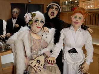 Jetzt sind Sie angekommen im Reich der Lust, der Schönheit (s-Chirurgie), der Dekadenz, des Schmerzes. Dazu wird eine höchst merkwürdige Diät verabreicht. Assistieren Sie bei einem feierlichen Tränensack-Lifting und erleben Sie bärtige Damen beim Bar-Pfleger Roh-Bärt. Sie werden Zeuge eines Face-Lifts mit Sicherheitsnadeln und besuchen Dr. Fielding bei einer Brustimplantat-Beratung. Erleben Sie Dr. Zwickmichs Entgiftungsmethode mit Spinnenseide. Wussten Sie übrigens, dass Kaviar den Alterungsprozess umkehrt und aus abgetrennten Hängebäuchen ganz tolle Sofakissen werden? Die Gewinnung von Botox aus vergammelten Brathähnchen ist ein Thema für sich. Was die Tote im Koffer angeht : daran ist möglicherweise der Spritzenpapst Dr. Branduardi schuld. Keine Sorge, Alraunes Großtante ist Miss Marple, sie ermittelt bereits vor Ort. Sie können den Flyer zur Ausstellung hier herunterladen (Download) ALRAUNES GRAND CAFÉ ![]() - Textile Illusionen - Öffnungszeiten von 1. Mai 2019 bis einschließlich 1. Nov 2019 nur Sonn- und Feiertags von 11:00 bis 17:00 UHR