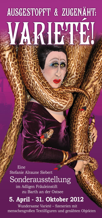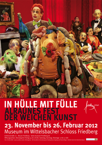 für das zu Wurst gewordene Fleisch, alles „Drei-Löwen-Takt Fahrradexpress Eyachtäler“ auf der Strecke ZAB4 Hechingen- Haigerloch-Eyach mit den Anschlüssen von Tübingen und Sigmaringen zum naldo-Tarif. Info: http://www.hzl-online.de/ Nur sonn- und feiertags, 1. Mai bis 20. Oktober 2013 ![]() zum Video Clip in der Landesschau Baden-Württemberg Phantastische Stoffwelten SWR Mediathek | Roland Altenburger | 30.4.2013 ![]() ALRAUNES WUNDERSAME FÄLLE UND UNGLAUBLICHE HEILUNGEN 28. März - 31. Oktober 2013 Im Adligen Fräuleistift zu Barth an der Ostsee www.vineta-museum.de Klinik im Kloster 2013 - kleine Vorschau ![]() ALRAUNES WUNDERSAME WELT 22. November 2012 - verlängert bis 17 März 2013 Museum im Wittelsbacher Schloss Friedberg Weitere Informationen zur Ausstellung: www.museum-friedberg.de ![]() VARIETÉ ! Sonderausstellung 5. April - 31. Oktober 2012 Adliges Fräuleinstift zu Barth an der Ostsee Wundersame Varieté - Szenerien: ...geflügelte Menschen...zersägte Jungfrauen...menschenfressende Riesenschlange... Weitere Informationen zur Ausstellung: www.vineta-museum.de ![]() gemalt - gehäkelt - gegossen Staatliche Kunsthalle Karlsruhe Junge Kunsthalle 3. Dezember 2011 - 1. April 2012 Hans-Thoma-Straße 4, 76133 Karlsruhe www.kunsthalle-karlsruhe.de ![]() Alraunes Fest der Weichen Kunst Museum im Wittelsbacher Schloss 86316 Friedberg Schlossstr. 21 23. November 2011 - 26 Februar 2012 verlängert bis 04. März 2012 www.museum-friedberg.de Sonderausstellung 28. Mai - 01. August 2011